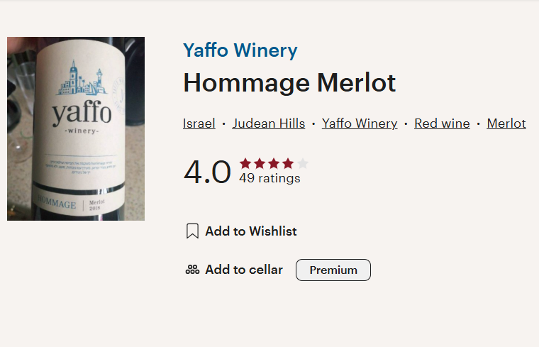 הומאז' מרלו של יקב יפו הוא יין אדום יבש ואצילי המופק מענבי מרלו מובחרים הגדלים בכרמים בהרי יהודה. זהו יין אלגנטי ורך אך בעל נוכחות עמוקה שמבטאת את אופיו של הטרואר המקומי. הוא מתיישן בחביות אלון צרפתיות למשך כשנה ומציג איזון מרשים בין פרי בשל לארומות עץ מעודנות. בטעימה מורגשים טעמי שזיף בשל דובדבן שחור וקקאו עם סיומת חלקה ומעודנת. מדורג 4.0 בויוינו.