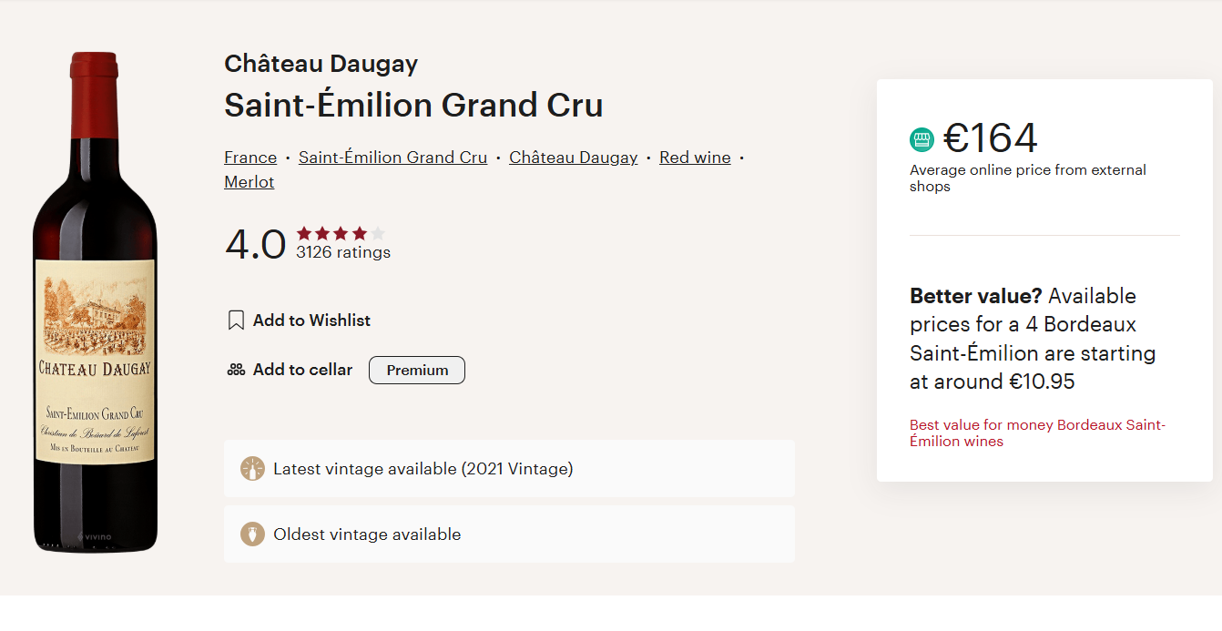 היה אצלנו לביקור במרץ ונחטף. מרלו מפואר מבורדו בסגנון סאן אמיליון, יבש בעל 14% אלכוהול, עוצמתי עם טאנינים וחמיצות מורגשים. בעל טעמי אלון, שוקולד, וניל ופירות סגולים. בעל דירוג ויוינו של 4.0.
