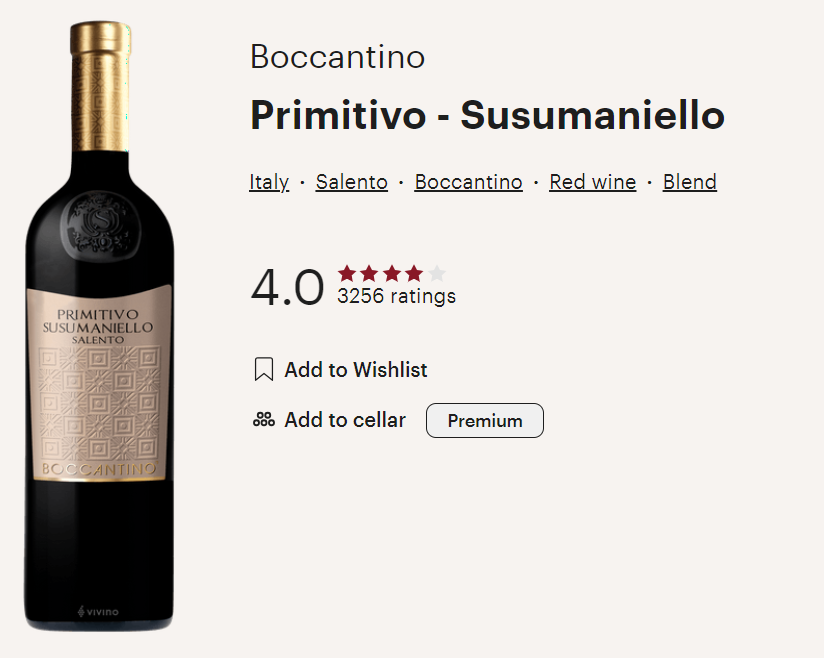 בלנד אדום חצי יבש (במונחים ישראליים) המורכב מ50% פרימיטיבו ו50% סוסומנילו אשר מגיעים מסלנטו פוליה, מקום הולדתם. היין יושן 3 חודשים בחביות עץ אלון ובעל גוף מלא ועשיר בעל טעמים של פירות אדומים כהים. בעל תווית יפיפייה (בעיני) ודירוג 4 בויוינו. 14% אלכוהול.
